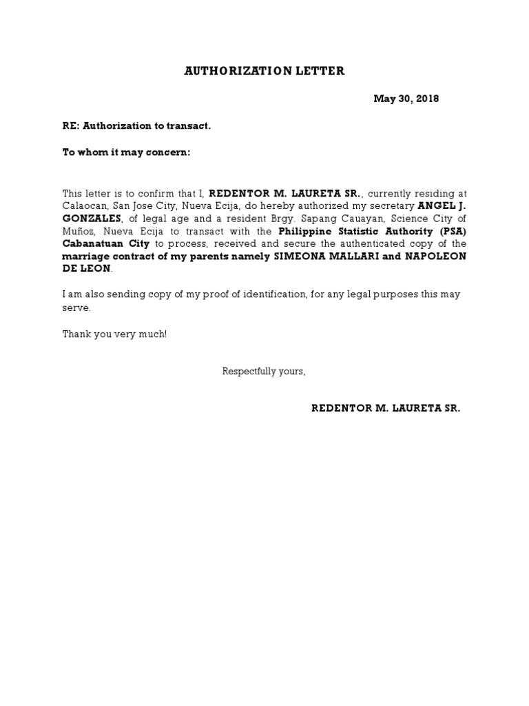 Sample authorization letter to transact. Begin your letter by clearly mentioning your full name and other contact details such as email address, contact number, and mention the corresponding date as well. These duties may be of. Send a letter of authorization to.